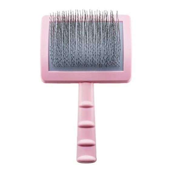 Szczotka z plastikowym trzonkiem, miękkie piny ze stali nierdzewnej, długość 25mm, kolor różowy Poduszka szczotki jest miękka i elastyczna, delikatnie dopasowuje się do krzywizn ciała zwierzęcia, nie podrażniając skóry. Ergonomiczny uchwyt jest wygodny w trzymaniu i nie wyślizguje się z dłoni, dzięki czemu nie nadwyrężysz nadgarstka podczas szczotkowania zwierzęcia.